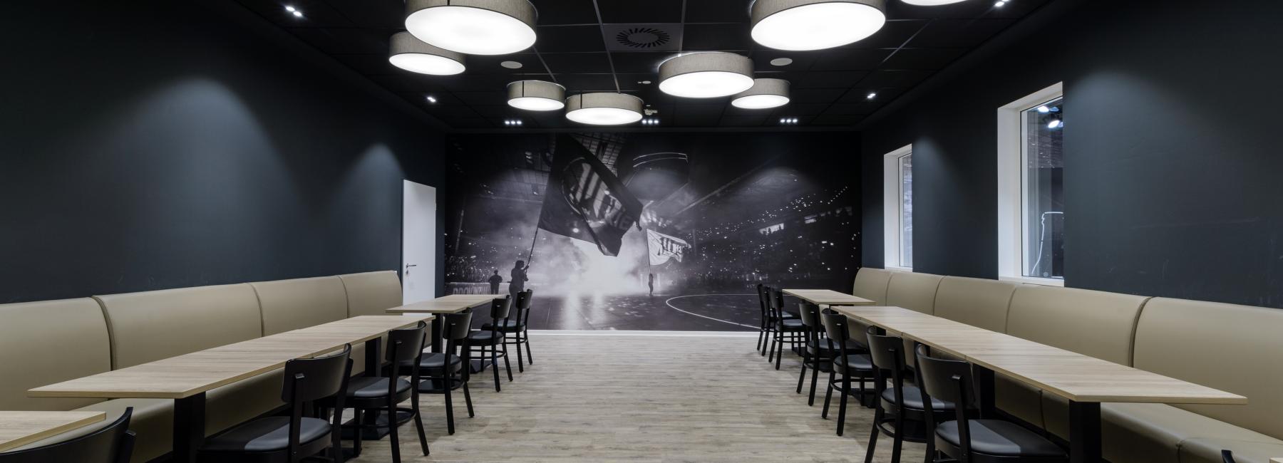 Ob morgendlicher Hotel-Gast, Kantinen-Besucher am Mittag oder die Sportler am Abend: Im Restaurant erwartet die Gäste dank des harmonisch aufeinander abgestimmten Innenraum-Konzepts ganztägig eine gemütliche Atmosphäre. Verschiedene Aufenthaltsbereiche ermöglichen sowohl einen abgeschirmten Rückzug als auch ein geselliges Beisammensein. Während die Wände in Schwarz gehalten sind, wurde für Tische und Sitzmöbel ein helles Braun gewählt. Passend dazu wurde der Boden gestaltet. Imke Stüven erläutert: „Die Holzoptik des Bodenbelags unterstreicht die natürlich wirkenden Oberflächen und das angenehm-freundliche Raumgefühl.“ Zum Einsatz kommt der multifunktionale LVT-Designbelag Gerflor Creation 70. Der strapazierfähige Objektboden wirkt durch das natürliche Design, die matte Oberfläche, die kristallklare Nutzschicht sowie die rundherum laufende Fase besonders hochwertig und passt sich so perfekt in die Innenarchitektur des Restaurants ein.