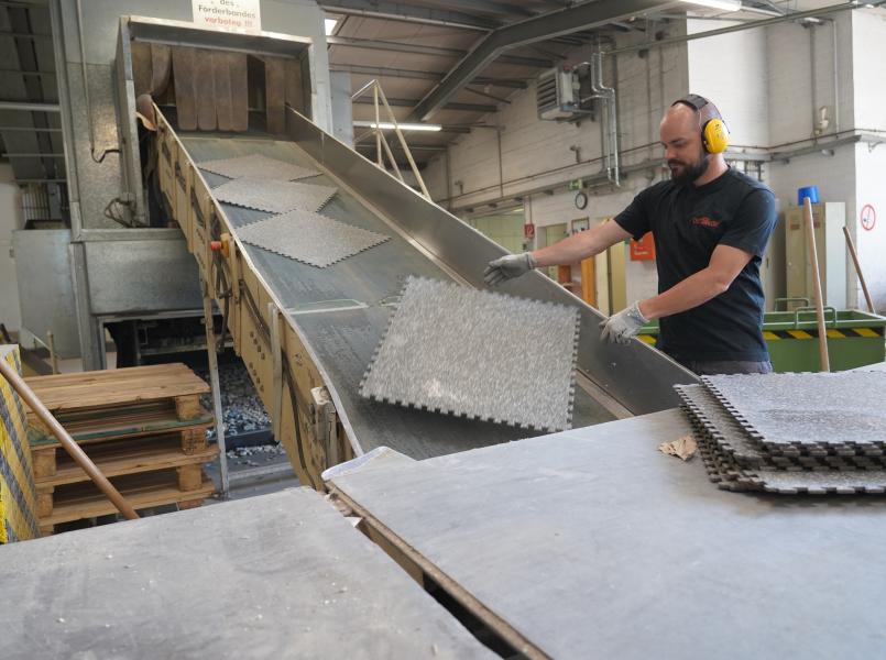 Das recycelte Material wird in die Herstellung neuer Bodenbeläge integriert. Durch unser Ökodesign stellen wir sicher, dass unsere Produkte einen hohen Anteil an Recyclingmaterial enthalten und gleichzeitig höchsten Qualitäts- und Sicherheitsstandards entsprechen.